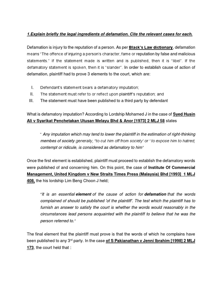 The Basics Of Defamation Law In Malaysia The Basics Of Defamation Law In Malaysia The Law Presumes Studocu